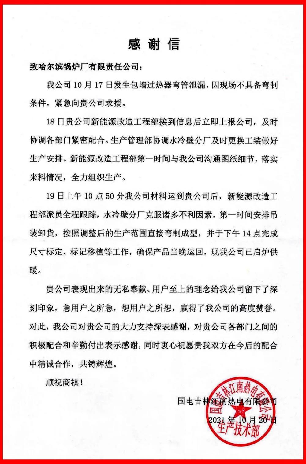 從接到用戶求援電話開始,哈電鍋爐各部門協(xié)同配合,想用戶之所想,用了不到三天的時(shí)間就將補(bǔ)供部件運(yùn)抵現(xiàn)場(chǎng)。哈電鍋爐用戶至上的理念深深地打動(dòng)了用戶,優(yōu)質(zhì)高效的服務(wù)贏得了用戶的高度認(rèn)可,用戶特發(fā)來(lái)感謝信表示感謝。