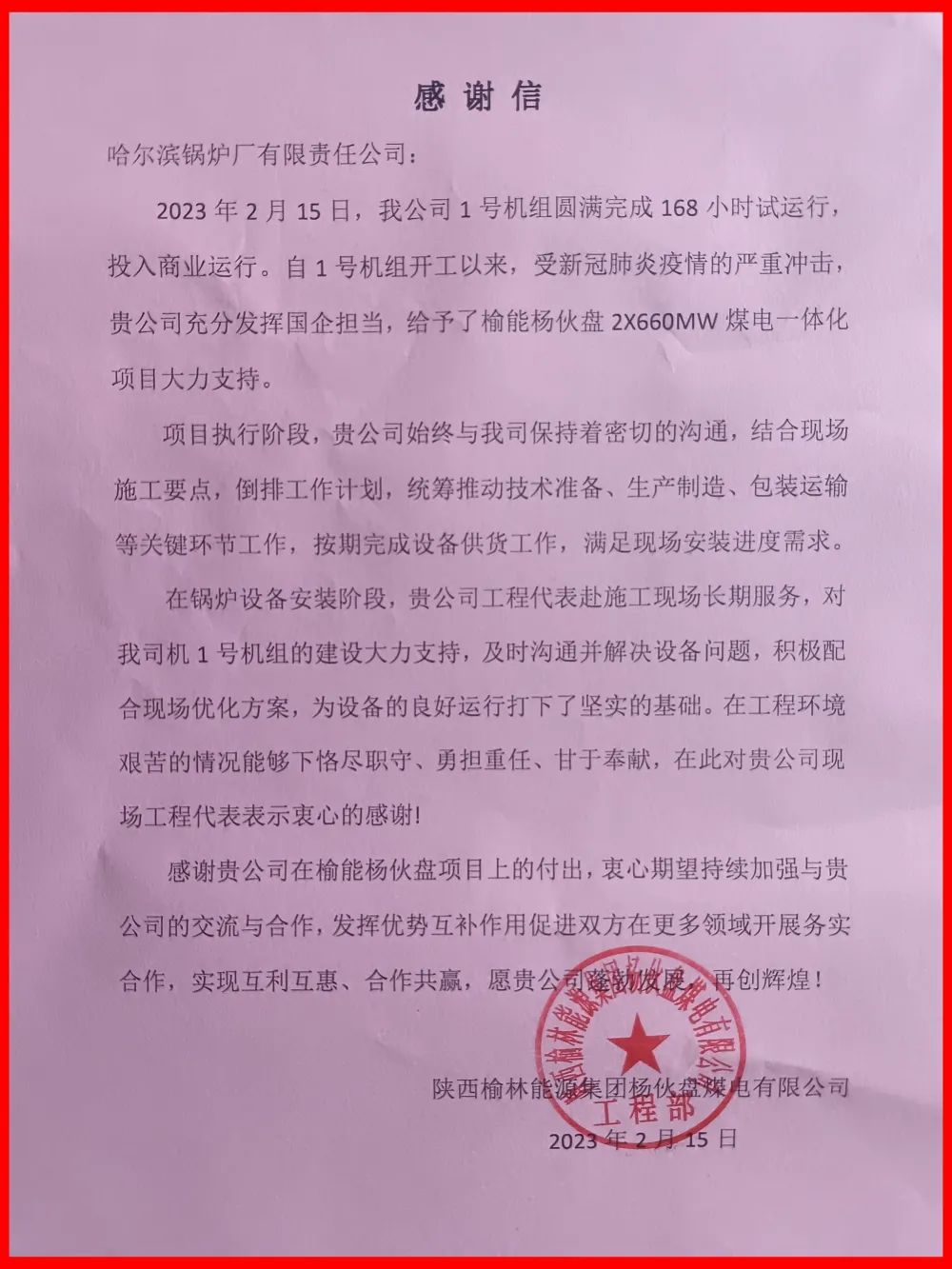 在鍋爐設備投產之際,用戶專門發(fā)來感謝信,對哈電鍋爐在機組建設中提供的工作支持表示由衷感謝,對哈電鍋爐過硬的產品質量和優(yōu)質高效的服務表示充分認可。下一步,哈電鍋爐將總結該項目1號機組鍋爐設備供貨和設備安裝經驗,全力做好2號機組鍋爐設備供貨和安裝工作,以實際行動滿足用戶需求,為用戶創(chuàng)造價值。